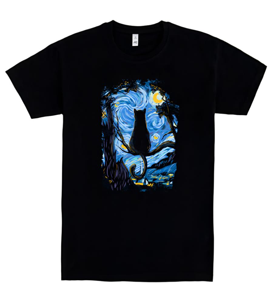 I’m Tee Van Night, the ultimate masterpiece of feline finesse. I’m here to whisk(er) you away to a world where Van Gogh meets catnip, blending the dreamy swirls of "Starry Night" with the mysterious silhouette of your favorite midnight prowler.